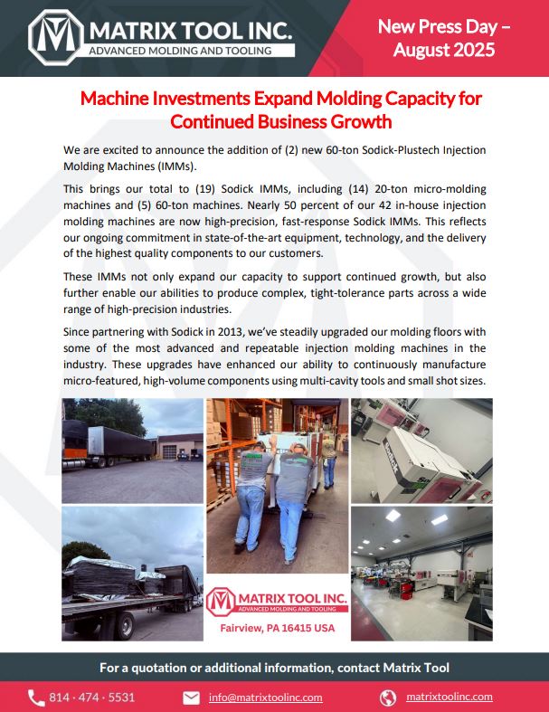 Machine Investments Expand Molding Capacity for Continued Business Growth We are excited to announce the addition of (2) new 60-ton Sodick-Plustech Injection Molding Machines (IMMs). This brings our total to (19) Sodick IMMs, including (14) 20-ton micro-molding machines and (5) 60-ton machines. Nearly 50 percent of our 42 in-house injection molding machines are now high-precision, fast-response Sodick IMMs. This reflects our ongoing commitment in state-of-the-art equipment, technology, and delivery of the highest quality components to our customers. These IMMs not … Read More